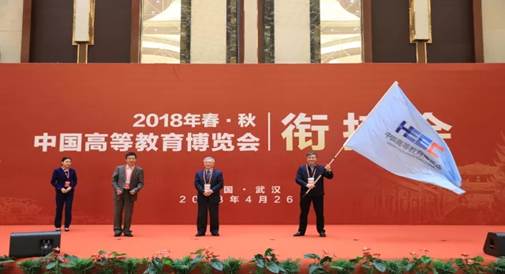在26日中午举行的中国高等教育博览会2018年春·秋衔接会上,武汉大学副校长周叶中代表湖北省高校实验室工作研究会将高博会会旗交还到高教学会管培俊副会长手中,管培俊副会长与四川省教育厅副厅长姜亚军完成了会旗交接,2018年秋季高博会将于10月19日—21日在四川成都举办。