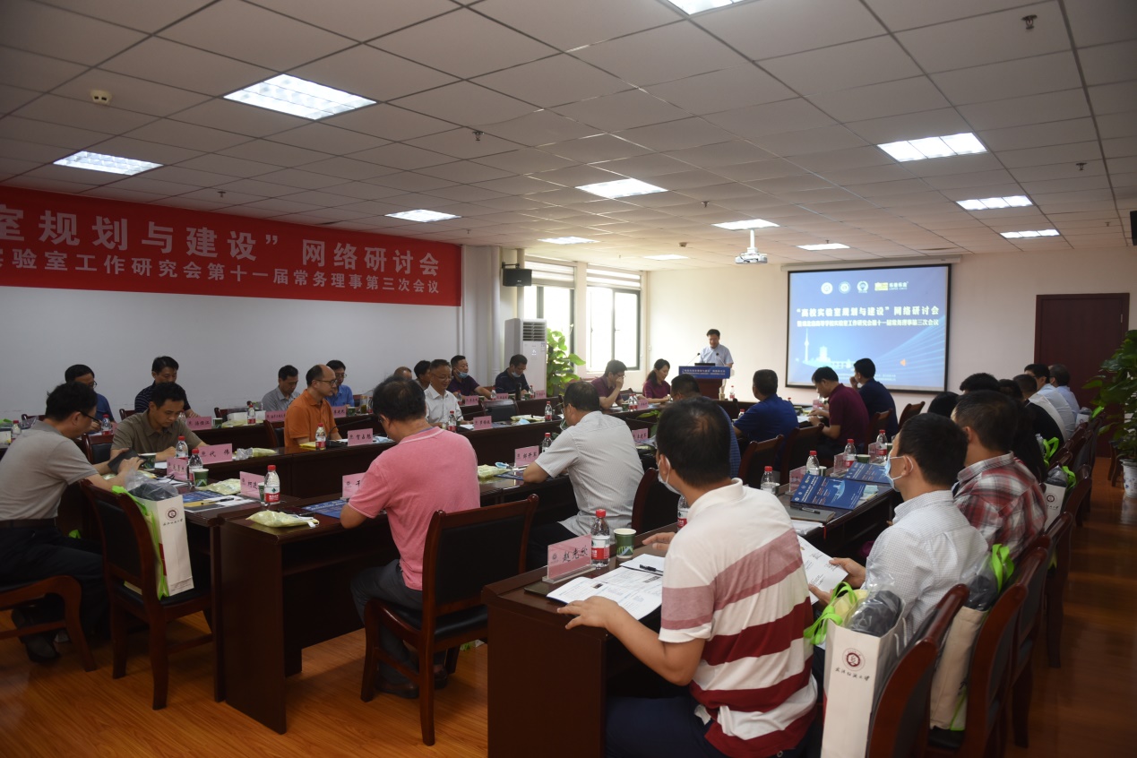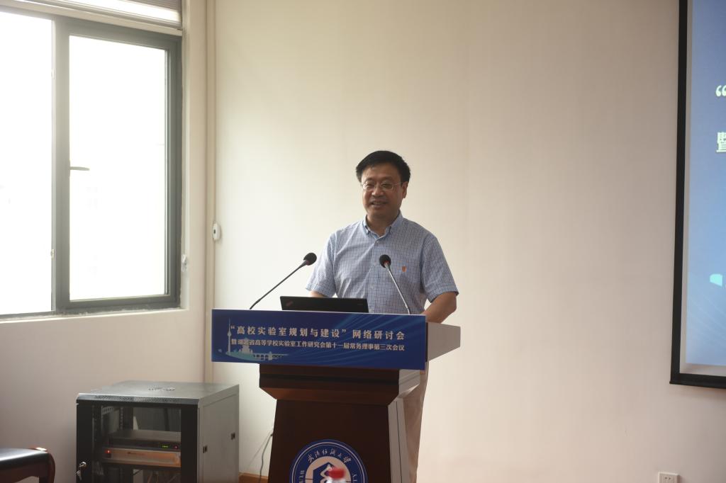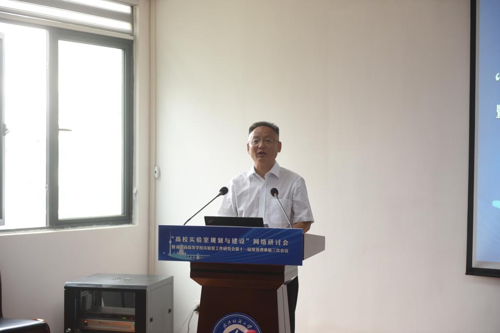 2020年9月11日下午,由研究会主办、武汉纺织大学承办的“高校实验室规划与建设”网络研讨会暨湖北省高等学校实验室工作研究会第十一届常务理事第三次会议通过线上、线下相结合的方式顺利召开。线下会场设在武汉纺织大学阳光校区,研究会常务理事、秘书处工作人员、相关企业代表参加会议,武汉纺织大学副校长罗锦银出席会议,会议由研究会副理事长、秘书长、华中科技大学实验室与设备管理处处长李震彪教授主持。