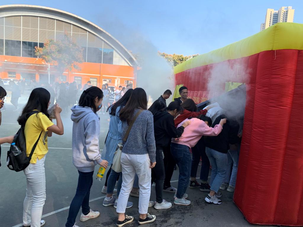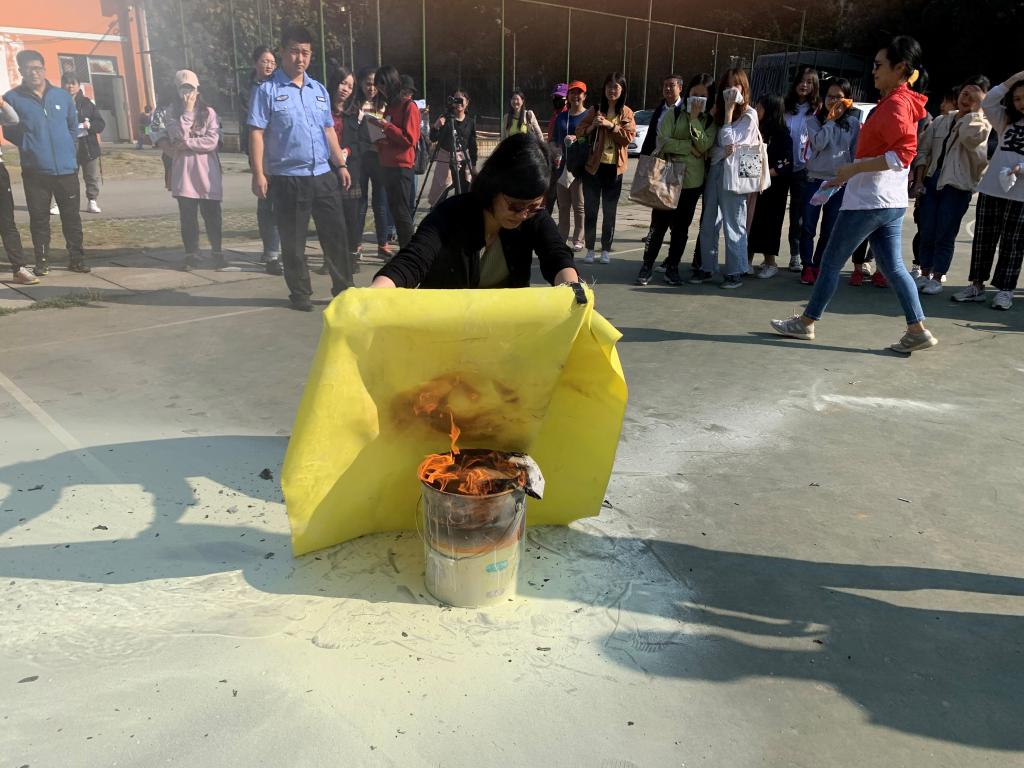 城环学院全体教职工、本科生和研究生共计1200人分6个批次参加了演练培训。在简短的介绍和讲解后,急促的警报声响起,滚滚的浓烟从火灾逃生帐篷喷出,各位师生在戚教官的指导下,用湿毛巾捂住口、鼻,弯腰低头依次进入漆黑的火灾逃生帐篷,扶着墙壁,顺着微弱的安全指示灯寻找出口、快速前进,有序撤离“火灾现场”。从逃生帐篷出来后,师生们又听教官们讲解了心肺复苏的要领以及灭火器、灭火毯、防烟罩的使用方法,并进行了实战演练。整个消防演练持续了三个小时。